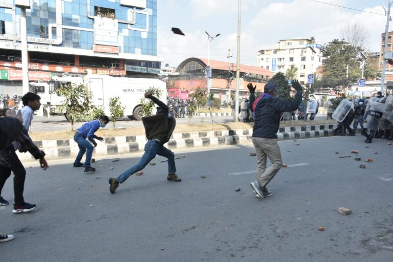 काठमाडौं, ४ फागुन । एमसीसीको विरोधमा आज काठमाडौंमा प्रदर्शन भएको छ । नयाँ बानेश्वर क्षेत्रमा भएको प्रदर्शनमा प्रहरी र प्रदर्शनकारीबीच घम्साघम्सी परेको छ । प्रदर्शनमा उत्रिएकाहरुले ढुंगा प्रहार गरेको भिडिओमा देखिन्छ । प्रहरीले पनि अश्रुग्याँस प्रहार गरेको छ ।