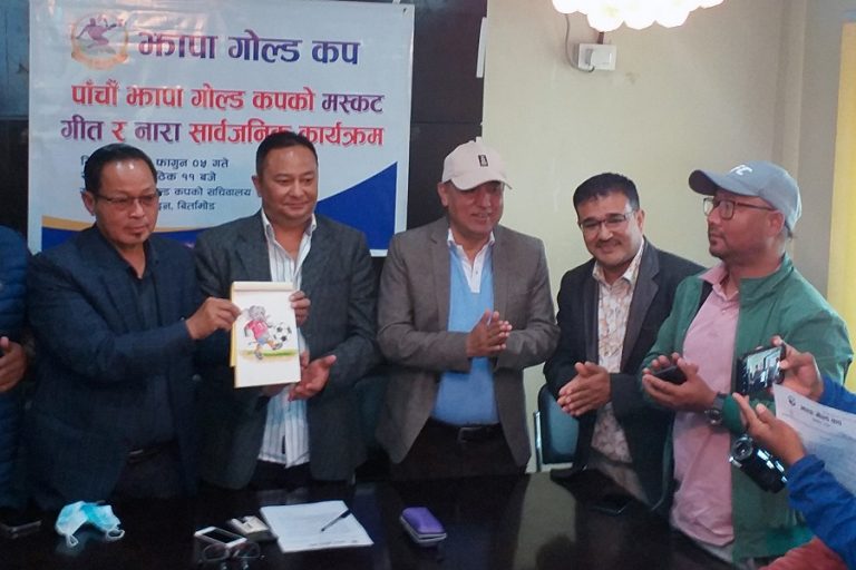 बनियानी, ५ फागुन: झापा गोल्डकपको पाँचौँ संस्करणका लागि मस्कट सार्वजनिक गर्दै झापा– ११ फुटबल क्लबका संरक्षक जलकुमार गुरुङलगायत । बिर्तामोडमा बिहीबार पत्रकार सम्मेलनको आयोजना गरी मस्कट सार्वजनिक गरिएको हो ।-तस्वीर : सन्तोष शर्मा-रासस
