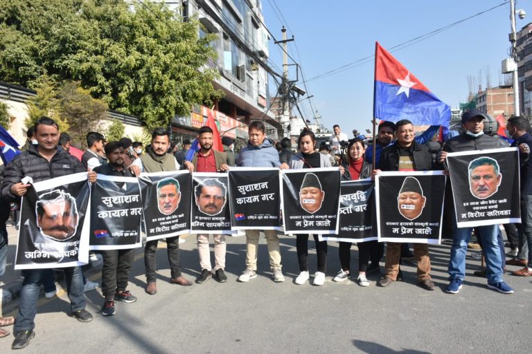 काठमाडौं, ५ फागुन । प्रमुख प्रतिपक्षी दल नेकपा (एमाले) को भातृ संगठन राष्ट्रिय युवा संघ नेपालले मूल्यवृद्धि, भ्रष्टाचारलगायतको विरोधमा प्रदर्शनमा उत्रिएको छ ।