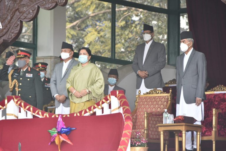 काठमाडौँ, ७ फागुन: नेपाली जनता रैतीबाट नागरिक घोषणा भएको ऐतिहासिक दिनका अवसरमा सैनिक मञ्च टुँडिखेलमा आज विशेष समारोहको आयोजना गरी राष्ट्रिय प्रजातन्त्र दिवस, २०७८ मनाइएको छ ।