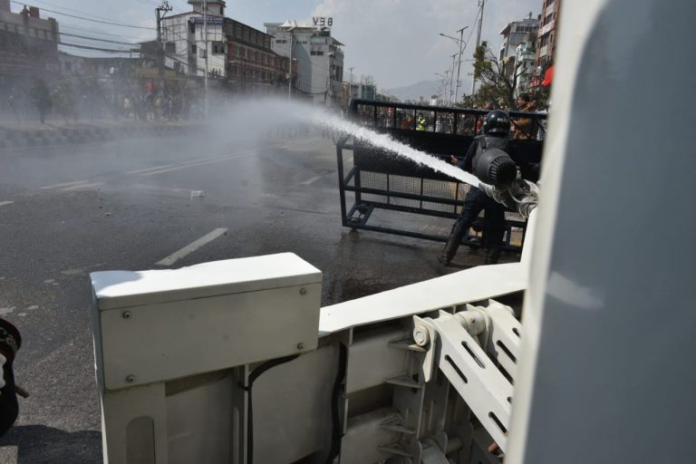 प्रदर्शनलाई मथ्थर बनाउन प्रहरीले पानीको सहायता लिएको छ ।