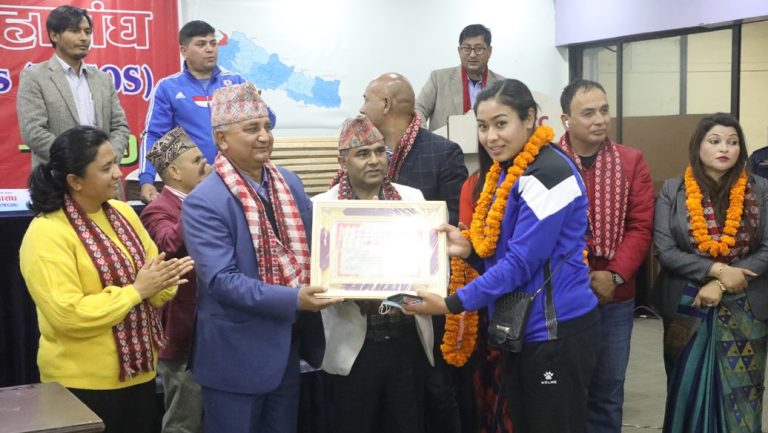 काठमाडौं, ८ फागुन । नेपाल खेलकुद महासंघ (नेकोस)ले खेलाडीलाई सम्मान गरेको छ । संघले एमालेका वरिष्ठ उपाध्यक्ष ईश्वर पोखरेलको आतिथ्यमा ब्याडमिन्टन, पारा तेक्वान्दो र महिला भलिबललगायत विभिन्न विधाका खेलाडीलाई नगदसहित शनिबार सम्मान गरेको हो ।