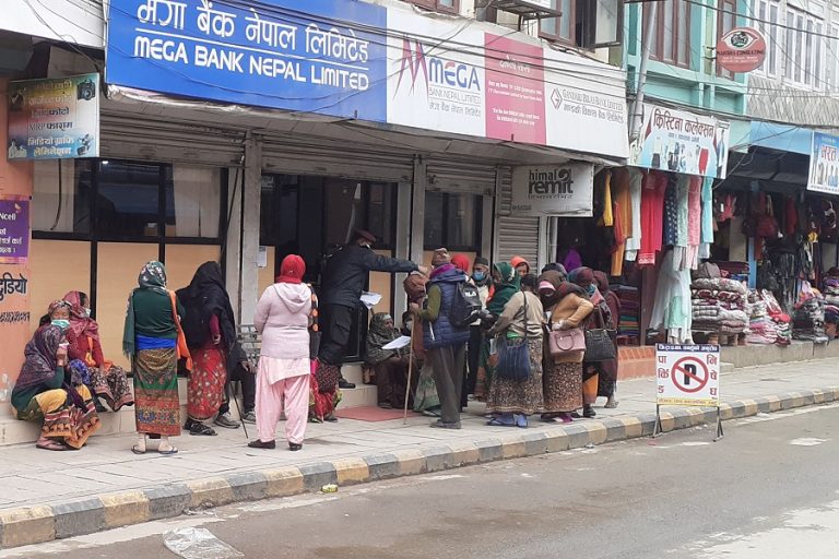 तनहुँ, ९ फागुनः तनहुँको सदरमुकाम दमौलीस्थित बैंकमा सामाजिक सुरक्षा भत्ता लिन ग्रामीण क्षेत्रबाट आएका ज्येष्ठ नागरिक ।-तस्बिरः सानेबहादुर नेपाली-रासस