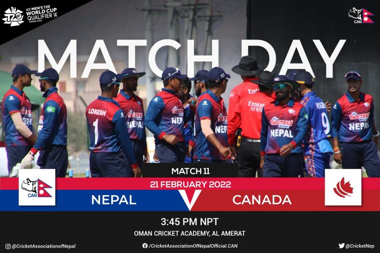 काठमाडौँ, ९ फागुन। आईसीसी पुरुष टी–ट्वान्टी विश्वकप ग्लोबल छनोट अन्तर्गत नेपालले क्यानाडाविरुद्ध बलिङ गर्ने भएको छ । ओमानस्थित अल अमेरात किक्रेट मैदानमा क्यानडाले टस जितेर ब्याटिंग रोजेको हो । विश्वकप छनोट अन्तर्गत नेपालले क्यानाडाविरुद्धको जित हात पार्दै सेमिफाइनलको यात्रा तय गर्ने योजनामा रहेको छ ।