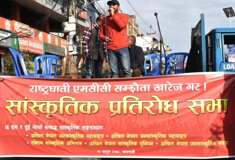 आज काठमाडौंको नयाँ बानेश्वरमा एमसीसी देशको हितमा नभएको भन्दै खारेजीको माग गरिएको हो । उक्त अवसरमा नो एमसीसी भन्दै सडक दोहोरी कार्यक्रमको समेत आयोजना गरिएको थियो ।