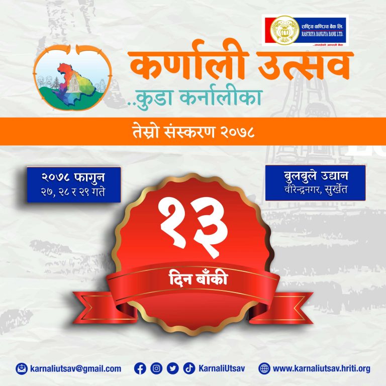 कर्णाली, १३ फागुन । ‘कर्णाली उत्सव’को तेस्रो संस्करण यही फागुन २७ देखि २९ गतेसम्म सञ्चालन हुने भएको छ । ‘कुडा कर्नाली’का भन्ने मूल नाराका साथ हरेक वर्ष फागुनमा सञ्चालन हुँदै आएको उत्सवको तेस्रो संस्करणमा कर्णालीसम्बन्धी र राष्ट्रिय विषयवस्तुमा बहस हुने आयोजक ऋति फाउण्डेशनले जनाएको छ ।