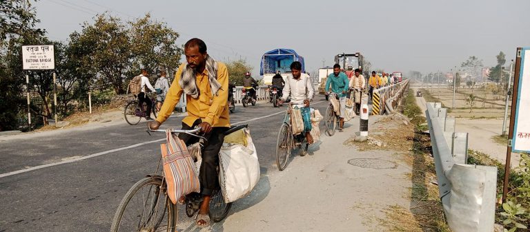दमक, १९ फागुन । साइकलबाट कवाडी सामान सङ्कलन गर्न झापा र दमकको गाउँ जाँदै मजदुर । गाउँघर पुगेर मजदुरहरुले पुनः प्रयोग हुने समानहरु खरिद गरी कवाडी समान आयात गर्ने थोक विक्रेतामा पु¥याएर विक्री गरेर आम्दानी गर्छन । तस्वीरः यज्ञराज आङदेम्बे÷रासस