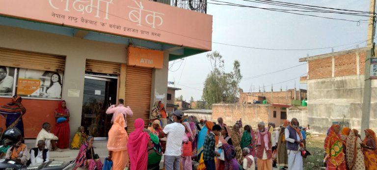 जलेश्वर, १९ फागुन । सामाजिक सुरक्षा भत्ताका लागि महोत्तरीको जलेश्वरस्थित लक्ष्मी बैङ्कमा पालो कुर्दै वृद्धवृद्धा । तस्वीरः सञ्जीतकुमार मण्डल÷रासस