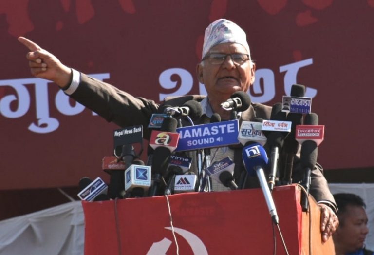 उनले मुलुक अहिले पूरै परनिर्भर भैसकेको पनि आरोप लगाए । अहिले गुन्द्रुक र जनैसमेत बाहिरबाट ल्याउनु पर्ने अवस्था आउँदा अब देश कसरी बन्छ? भन्दै प्रश्न गरे । उनले अहिले ७ महिनादेखि संसद् चल्न नसकेको र न्यायापालिका ध्वस्त भएको पनि गुनासो पोखे । Photo By: Mukunda Kalikote/ReportersNepal