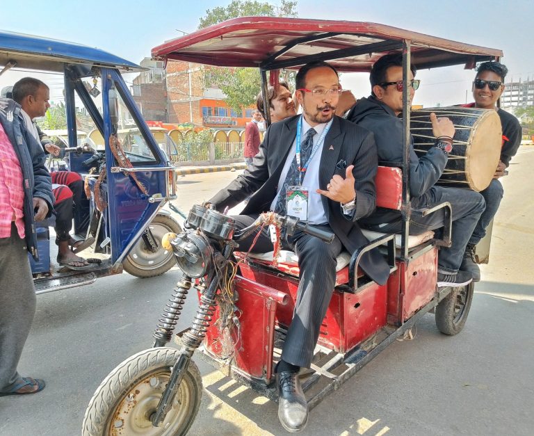 जनकपुर, २० फागुन । नविल बैंकका प्रमुख कार्यकारी अधिकृत (सिइओ) अनिल केशरी शाह जनकपुरमा नेपालको चर्चीत ब्यान्ड कुटुम्बका सदस्यलाई बसाएर ई–रिक्सा चलाउदै ।