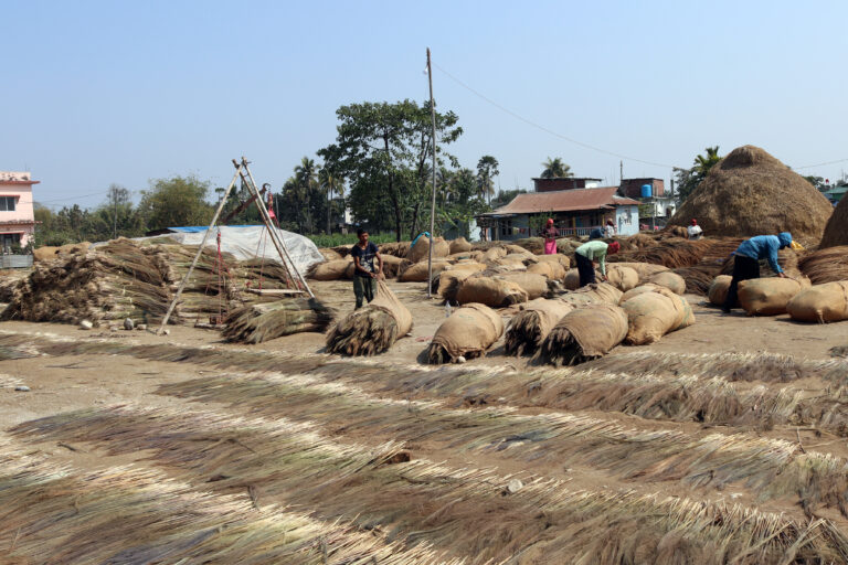 सुरुङ्गा, २३ फागुन । पूर्वी पहाडी जिल्ला इलाम, पाँचथर र ताप्लेजुङबाट सङ्कलन गरी झापाको बिर्तामोडस्थित हेवन वार्टर पार्क नजिकै ल्याएर सुकाई राखिएको अम्रिसोको कुचो भारतलगायत तेस्रो देशमा निर्यात गर्न व्यवस्थापन गर्दै मजदुर । पूर्वी पहाडी जिल्ला इलाम, पाँचथर र ताप्लेजुङबाट सङ्कलित अम्रिसो झापा ल्याएर भारतलगायतका तेस्रो देशमा बर्सेनि निर्यात गर्ने गरिन्छ । तस्बिरः सुरेन्द्र भण्डारी÷रासस