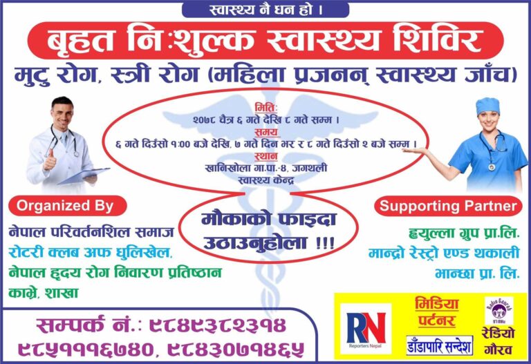 शिविरको मिडिया पार्टनरमा भने रिपोर्टर्स नेपाल डटकम अनलाईन, डाँडापारी सन्देश र रेडियो गौरव रहेका छन् । शिविर भने खानीखोला गाउँपालिका ४, जगथली स्वास्थ्य केन्द्रमा हुने जनाईएको छ ।
