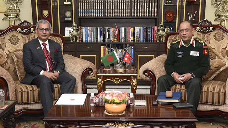 काठमाडौं, २५ फागुन । प्रधान सेनापति महारथी प्रभुराम शर्मा र नेपालका लागि मित्रराष्ट्र बंगलादेशका राजदूत सल्लाहुदिन नोमन चौधरीबीच आज जङ्गी अड्डामा शिष्टाचार भेटवार्ता भएको छ ।