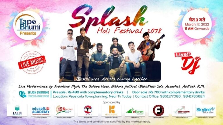 काठमाडौं, २६ फागुन । तपोभुमी ट्राभल्स एण्ड टुर्स प्रा.लि.ले होलीको दिन (चैत्र ३ गते) पुल पार्टीको आयोजना गर्ने भएको छ । ट्राभल्सले पेप्सीकोला टाउन प्लानिङ,स्प्ल्लास स्विमिङ फिटनेस एण्ड योगा स्टुडियोमा विशेष कार्यक्रमको आयोजना गर्न लागेको हो ।