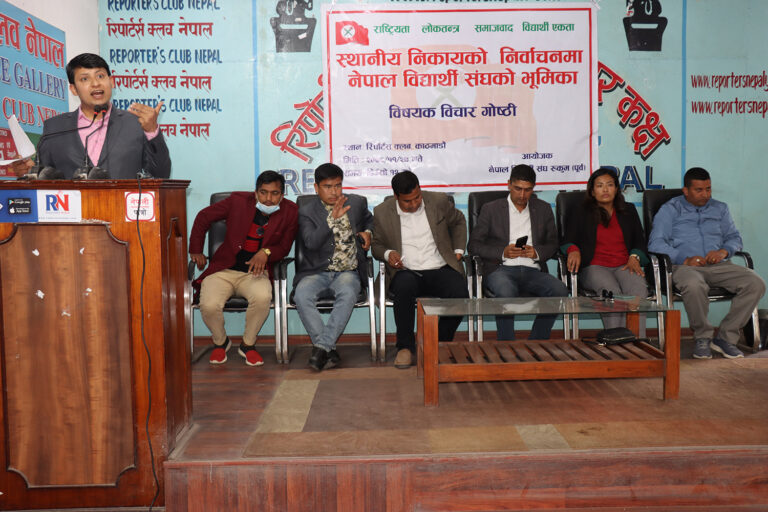 काठमाडौं, २७ फागुन । नेपाली कांग्रेसको भातृ संगठन नेपाल बिद्यार्थी संघका अगुवा नेता तथा कार्यकर्ताहरुले युवा विद्यार्थीहरुलाई आगामी स्थानीय तहको चुनावमा महत्वपुर्ण भुमिका दिन पर्ने धारणा राखेका छन् । आज (शुक्रबार) रिपोर्टर्स क्लब नेपालमा पत्रकार सम्मेलन गर्दै आगामी चुनावमा कांग्रेसलाई जिताउन नेविसंघले महत्वपुर्ण भुमिका खेल्ने नेताहरुले दाबी गरेका हुन् ।