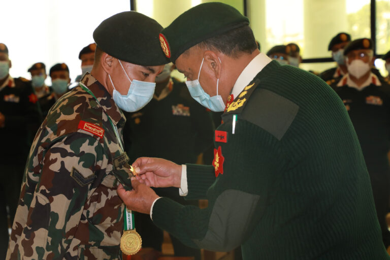 सैनिक मुख्यालय जङ्गी अड्डामा आयोजित कार्यक्रममा सहायकरथीबाट उपरथीमा यही फागुन २६ गते पदोन्नति भएका अधिकारीलाई दज्र्यानी चिह्न प्रदान गरिएको हो । सेनाले उपरथी अधिकारीलाई राष्ट्रिय निकुञ्ज तथा पर्यावरण संरक्षण महानिर्देशकको जिम्मेवारी दिएको छ । रासस/तस्बिरः रत्न श्रेष्ठ