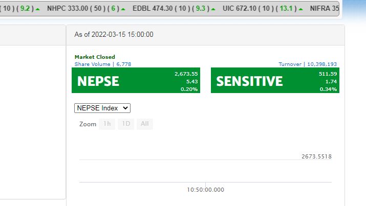 आज ५.४३ अंक बढेर २६७३.५५ को विन्दुमा पुगेको हो । सो सेसनमा सेन्सेटिभ इण्डेक्स १.७४ अंक बढेको छ।