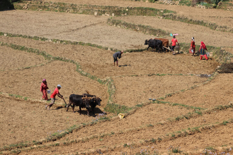 त्रिशुली, ३ चैत । नुवाकोटको सूर्यगढी गाँउपालिका–५ गणेशस्थानका किसान खेतमा गोरुको सहायताले मकै रोप्दै । पछिल्लो समयमा खेतबारी जोत्न ट्र्याक्टरको प्रयोग बढे पनि मकै लगाउन सहज हुने भएकाले गोरुको प्रयोग कायम छ । तस्वीरः रामहरि न्यौपाने÷रासस
