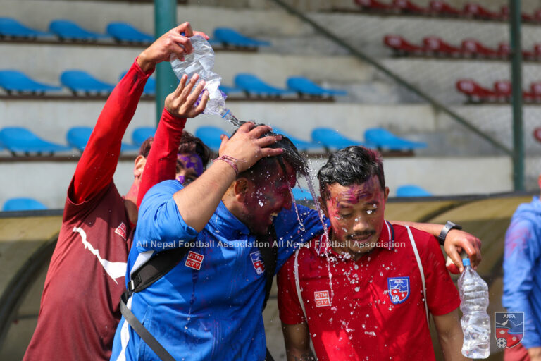 प्रशिक्षणमा रहेका टोलीका खेलाडीहरुले मैदानमै होली मनाएका हुन् । आज देशको पहाडी भेगमा होली मनाइँदै छ । तस्विरः एन्फा