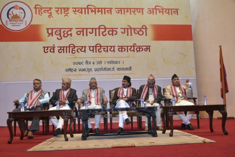 काठमाडौं, ५ चैत्र । हिन्दुराष्ट्र स्वाभिमान जागरण अभियानले ‘प्रबुद्ध नागरिक गोष्ठी एवम् साहित्य परिचय कार्यक्रमको आयोजना गरेको छ ।