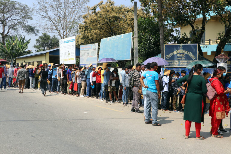 चितवन, ६ चैत । आगामी वैशाख ३० मा हुने स्थानीय तह निर्वाचनका लागि जिल्ला प्रहरी कार्यालय चितवनले माग गरेको म्यादी प्रहरीमा आवेदन दिन लामबद्ध युवा । तस्बिरः सुरेन कुँवर÷रासस