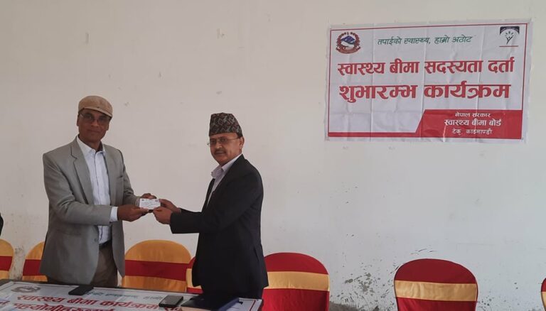 नगर प्रमुख घनश्याम गिरी र बोर्डका कार्यकारी निर्देशक दामोदर बसौलाले संयुक्तरुपमा बुधबार आयोजित कार्यक्रममा चनपा–४ का ७४ वर्षीय ज्येष्ठ नागरिक तुइलाल नकर्मीलाई बीमा कार्ड वितरण गरी स्वास्थ्य बीमा कार्यक्रमको शुभारम्भ गरे । आजदेखि नगरका १५ वटै वडामा दर्ता सहयोगीले बीमा दर्ता गराउन सुरु गर्ने जनाइएको छ ।