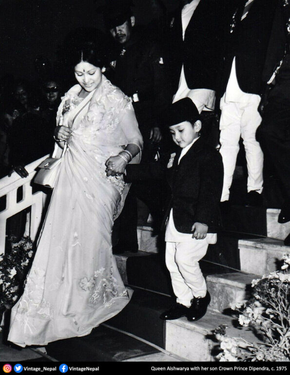 काठमाडौं, १० चैत्र । यो तस्बिर सन् १९७५ को हो । तस्बिरमा रानी ऐश्वर्या आफ्ना बालक छोरा युवराज दीपेन्द्र शाहलाई हात समातेर खुड्किलो झर्दै गरेकी देखिन्छिन् ।