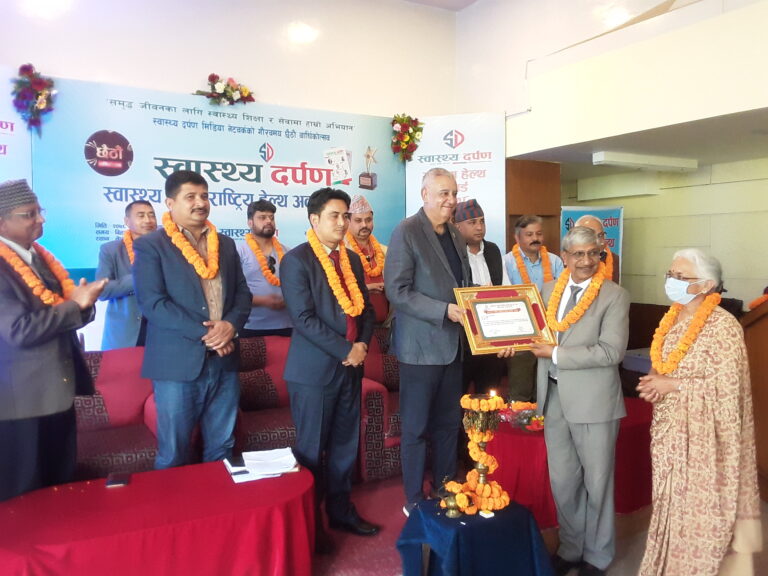 काठमाठौं, १२ चैत । स्वास्थ्य दर्पण मिडिया नेटवर्कले आफ्नो छैटौँ वार्षिकोत्सकका अवसरमा राजधानीमा आज आयोजित एक समारोहबीच ‘स्वास्थ्य दर्पण राष्ट्रिय हेल्थ अवार्ड २०७८’ प्रदान गरेको छ ।