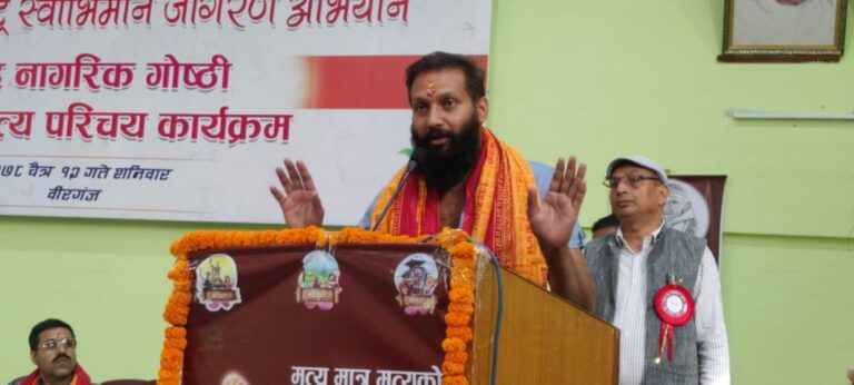 देशमा हिन्दु धर्मलाई समाप्त पार्ने गरी प्रायोजित गतिविधि भएको सुनाए । उनले आफू र आफ्नो धर्म संस्कृतिलाई चिन्नमा जोड दिए ।