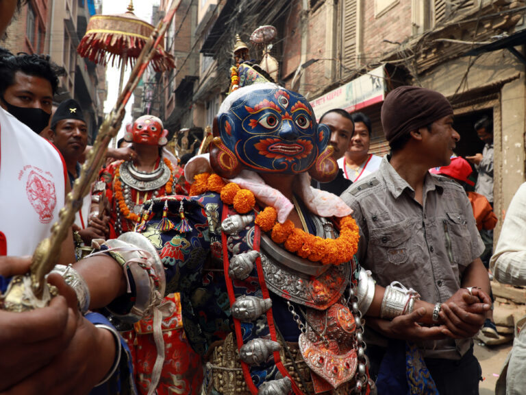काठमाडौं, १४ चैत । नरदेवीको श्वेतकाली ‘ङतभुलु अजिमा’को १२ वर्षे जात्राको अवसरमा सोमबार नगर परिक्रमा साथ नाच प्रदर्शनी श्वेतकाली र कुमारी । देवगणमा श्वेतकाली अजिमा, कुमारी, भैरव, बाराही, गणेश, द्रौपती सिंघेणी, बाधिणी, महालक्ष्मी, ब्रह्मायणी, इन्द्रायणी र नारायणी रहन्छ । तस्वीरः रत्न श्रेष्ठ÷रासस