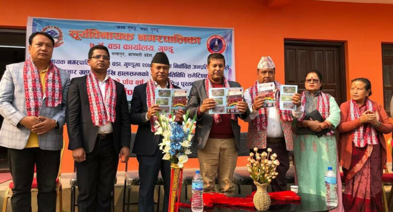 भक्तपुर, १५ चैत्र । सूर्यविनायक नगरपालिका ७ नं वडा गुण्डूमा जनप्रतिनिधिको पाँच वर्ष नामक सचित्र पुस्तक लोकार्पण भएको छ। नेकपा एमालेका पोलिटब्युरो सदस्य,पूर्वमन्त्री,प्रतिनिधि सभा सदस्य महेश बस्नेतको प्रमुख आतिथ्यतामा सो पुस्तक सार्वजनिक गरिएको हो । पुस्तकमा २०७४ सालमा निर्वाचित जनप्रतिनिधिहरुले पदभार ग्रहण गरेदेखि हालसम्म वडामा भएका मुख्य विकास निर्माणको समग्र गतिविधि समेटिएको छ ।