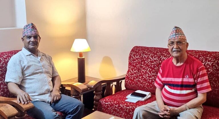 काठमाडौं, चैत १८ । नेकपा (एमाले)का अध्यक्ष केपी शर्मा ओली र राप्रपाका महामन्त्री एवं नेपालगञ्ज उपमहानगरपालिका मेयर धवल शम्मशेर राणाबीच भेटवार्ता भएको छ ।