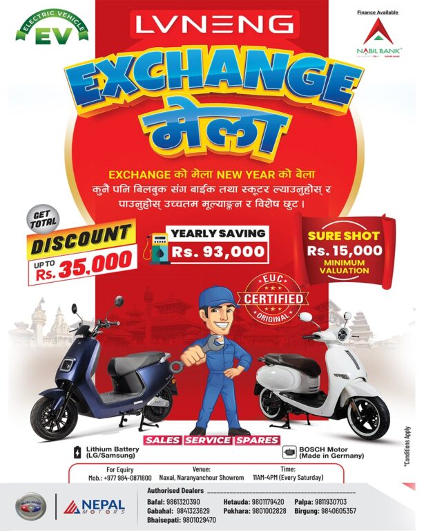 काठमाडौं, १८ चैत्र । Lvneng Scooter को आधिकारिक विक्रेता तथा वितरक EV MOTORS Nepal ले हरेक शनिबार बिहान ११ बजेदेखि बेलुकी ४ बजे सम्म exchange मेला कार्यक्रम आयोजना गरिरहेको छ ।