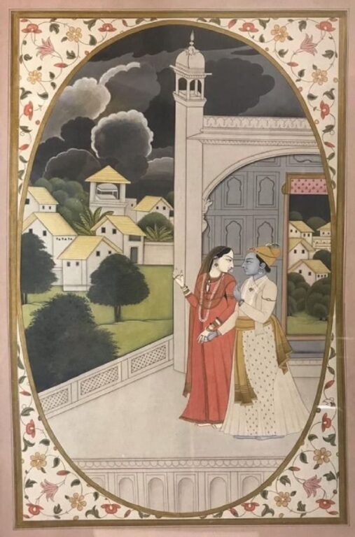 राधा र कृष्ण चित्रमा देखिन्छन् । यो परम्परागत पहारी स्कुल चित्र हो । चित्रको पृष्ठभूमिमा हरियाली र घरहरु देखिन्छन् ।