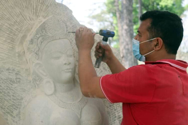 सिद्धार्थनगर, २२ चैत । रुपन्देहीको देवदहमा जारी प्रस्तर कला प्रदर्शनीमा ढुङ्गामा कला उतार्दै कलाकार । तस्बिरः नरेश केसी÷रासस