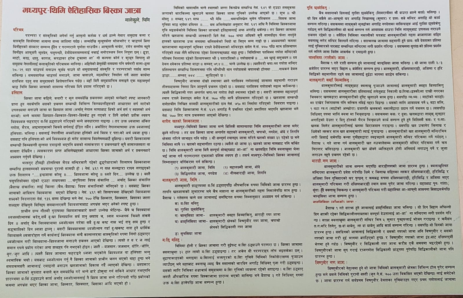 काठमाडौं, २२ चैत्र । मध्यपुर थिमी नगरपालिकाले ऐतिहासिक पर्व ‘बिस्का जात्रा’लाई विश्व सम्पदा सूचीमा सूचीकृत गर्ने अभियान सुरु गरेको छ ।