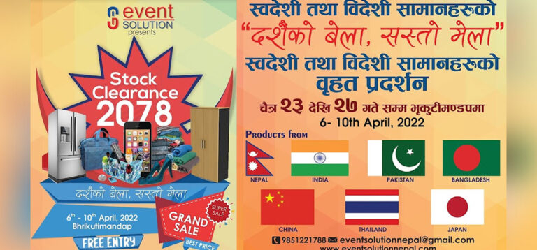 इभेण्ट सोलुसन प्रालिले ‘दशैंको वेला सस्तो मेला’ भन्ने नाराका साथ आयोजना गरेको स्टक क्लियरेन्स मेला पाँच दिनसम्म चल्नेछ। एक्स्पोमा चैते दशैंका साथै दैनिक उपभोगका लागि आवश्यक सबै किसिमका सामग्रीको कारोबार भईरहेको छ ।