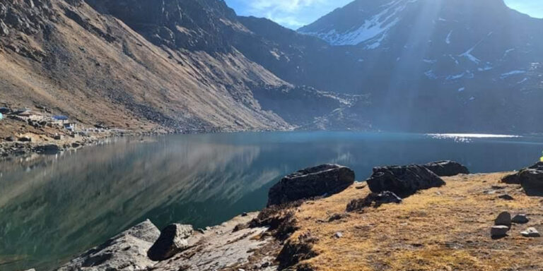 रसुवा, २३ चैत । चार हजार ३८० मिटर उचाइमा रहेको रसुवाको तीर्थस्थल गोसाइँकुण्ड । पुस, माघ महिनामा भएको हिमपात र चिसोका कारण जमेको पानी पग्लिएपछि अहिले कुण्डमा डुबुल्की मार्न र स्नान गर्न सहज भएको छ । तस्बिरः ज्ञानेन्द्र न्यौपाने÷रासस