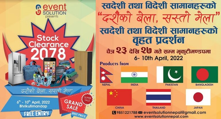 अधिक रुचाइएको यो मेला वर्षेनी आयोजना हुँदै आएकोमा पछिल्लो वर्ष कोरोना महामारीका कारण आयोजना हुन सकेको थिएन । ‘दशैंको बेला सस्तो मेला’ भन्ने नाराका साथ आयोजना हुने स्टक क्लियरेन्स मेला ५ दिनसम्म सञ्चालन हुनेछ । एक्स्पोमा चैते दशैंका साथै दैनिक उपभोगका लागि आवश्यक सबै किसिमका सामाग्रीहरुको कारोबार हुने आयोजक संस्था इभेण्ट सोलुसन प्रालिका बजार निर्देशक नविन भट्टले बताए ।