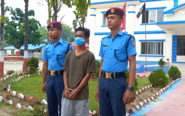 गाइघाटमा पत्रकार सम्मेलन गर्दै प्रहरीले बेलका ३, किराँतचोकका १९ वर्षे विनोद ढकाल खत्रीलाई सार्वजनिक गरेको हो ।