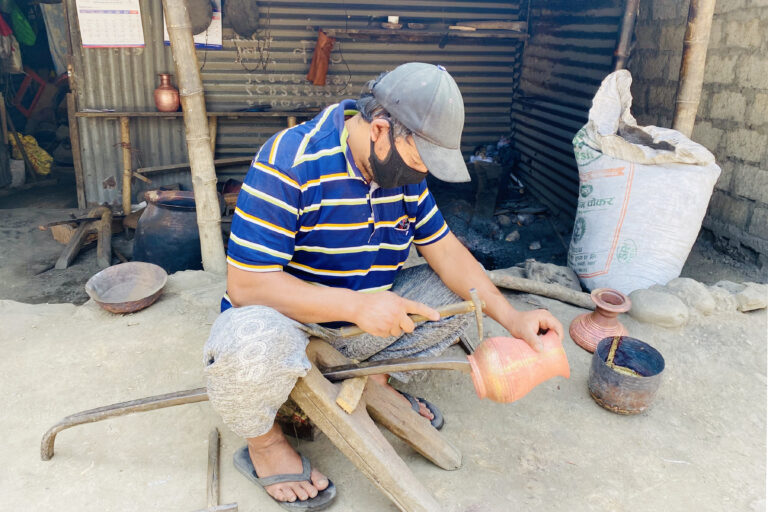 बागलुङ, २५ चैत । बागलुङको गलकोट नगरपालिका–३ हटिया बजारका कालिगढ कृष्णबहादुर विक तामाको भाँडा बनाउँदै । तस्बिरः रामबहादुर थापा÷रासस