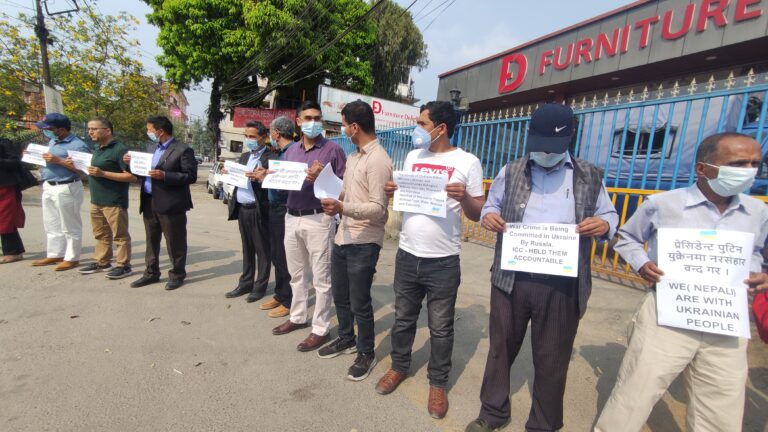 उनीहरुले बोकेका प्लेकार्डमा ‘प्रेसिडेन्ट पुटिन नरसंहार बन्द गर’, ‘हामी युक्रेन तथा युक्रेनी जनताको साथमा छौं’ लगायतका नारा लेखिएका थिए ।