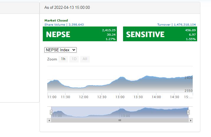 काठमाडौं, ३० चैत । यस वर्षको अन्तिम दिन सेयर बजार परिसूचक नेप्से दोहोरो अंकले बढेको छ ।