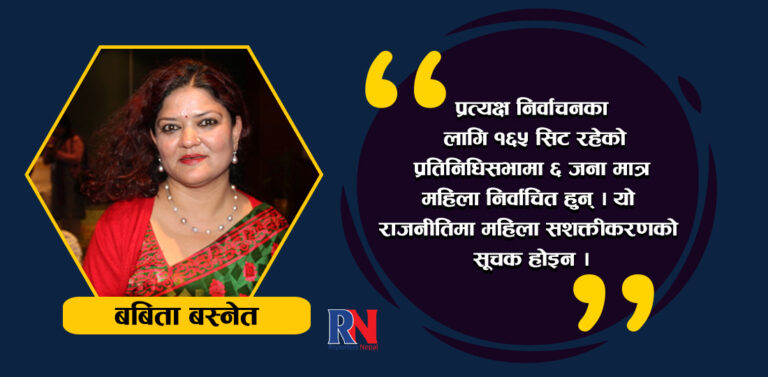 यसैगरी संसद्को कुरा गर्दा २०६४ सालमा सम्पन्न पहिलो संविधानसभामा १२.५ प्रतिशत महिलाहरू प्रतिस्पर्धात्मक प्रणालीबाट संसद््मा पुगेका थिए । विसं २०७० सालमा सम्पन्न दोस्रो संविधानसभामा प्रत्यक्ष निर्वाचनबाट विजयी महिला सांसदको संख्या ४.१७ प्रतिशतमा झ¥यो । २०७४ सालमा सम्पन्न आम निर्वाचनमा प्रतिस्पर्धाबाट आउने महिलाको संख्या ३.३६ प्रतिशत छ । नामै लिन सकिन्छ, पम्फा भुषाल, कमला रोका, विना मगर, पबित्रा निरौला, पद्मा अर्याल र दुर्गा पौडेल प्रतिनिधिसभामा प्रत्यक्ष निर्वाचन प्रणालीबाट निर्वाचित सांसद हुन् । प्रत्यक्ष निर्वाचनका लागि १६५ सिट रहेको प्रतिनिधिसभामा ६ जना मात्र महिला निर्वाचित हुन् । यो राजनीतिमा महिला सशक्तीकरणको सूचक होइन । यद्यपि समानुपातिक ब्यवस्थाका कारण संघीय संसद् र राष्ट्रिय सभा दुवैमा ३३ प्रतिशत महिला सहभागिता रहेको छ ।