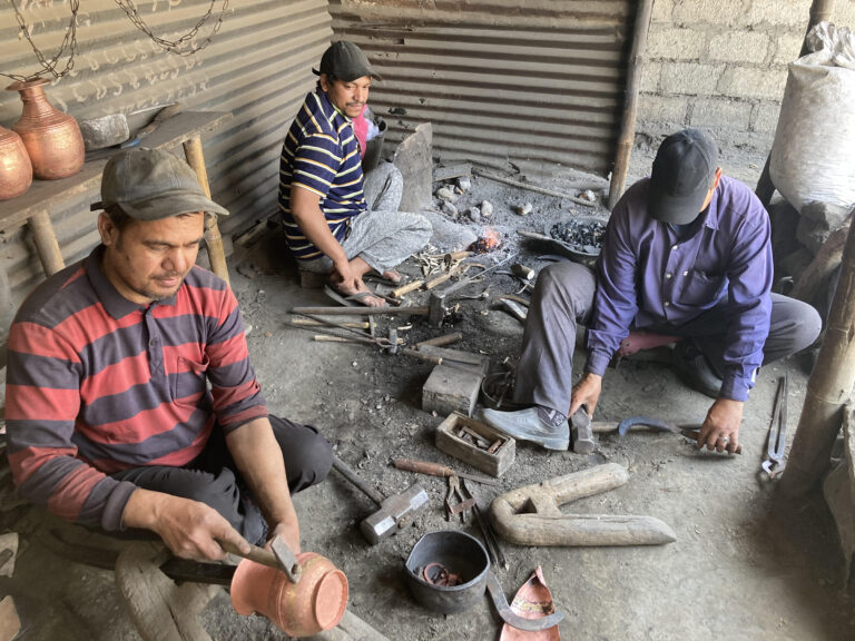 बागलुङ, २ वैशाख । बागलुङको गलकोट नगरपालिका–३ हटिया बजारमा रहेको बिहुँ आरन सेवामा तामाका भाँडा बनाउँदै कालिगढ । गलकोटमा तामाका भाँडा बनाएर विश्वकर्मा परिवारका तीन भाइ कृष्ण, देवीलाल र रामबहादुर विश्वकर्माले मासिक रु एक लाख आम्दानी गर्ने गरेका छन् । तस्वीरः खेमराज गौतम÷रासस