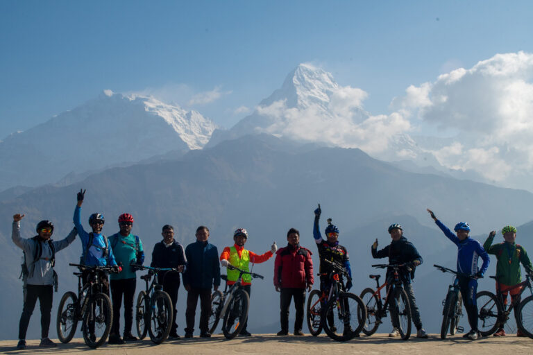 म्याग्दी, ३ वैशाख । साइकल चढेर म्याग्दीको अन्नपूर्ण गाउँपालिका–६ मा पर्ने घोडेपानीमा पुगेका पोखरा साइकल सिटीका साइकल यात्री । पर्यटक आकर्षित गर्नका लागि घोडेपानीदेखि प्याराबाराही ताल जोड्ने गुराँसको जङ्गलभित्र साइकल मार्ग सञ्चालन गरिएको छ । तस्वीरः सन्तोष गौतम÷रासस