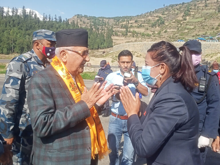सिमकोट, ४ वैशाख । हुम्ला पुगेका नेपाल कम्युनिष्ट पार्टी (एमाले) का अध्यक्ष केपी शर्मा ओलीलाई स्वागत गर्दै हुम्लाका प्रमुख जिल्ला अधिकारी सीता परियार । तस्वीरः दाने बोहरा ÷रासस