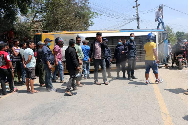 भक्तपुर, ४ वैशाख । चाँगुनारायण नगरपालिका–९, ताथली नाला सडकखण्डको घुम्ती ल्होँपामा आज दिउँसो सडकमै पल्टिएर दुर्घटना भएको बा ४ ख ६२१ नम्बरको बस । बस दुर्घटना हुँदा मानवीय क्षति भने भएको छैन । तस्बिरः रमेश गिरी÷रासस