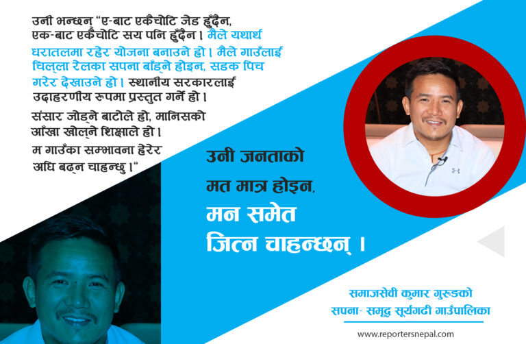 हुन त सूर्यगढी गाउँपालिका नेपाली कांग्रेसका नेता डा. रामशरण महत, अर्जुननरसिंह केसी, डा. प्रकाशशरण महतहरुको थातथलो हो । तर, गाउँले जनआकांक्षा अनुसार काँचुली फेर्न सकेको छैन । त्यसैले गाउँ–गाउँमा सिंहदरबार भन्ने नाराको सार्थकता निम्ति यस पटकको स्थानीय तह निर्वाचनमा नेपाली कांग्रेसका तर्फबाट सूर्यगढी गाउँपालिकाको प्रमुखमा सशक्त दाबेदारी प्रस्तुत गरिरहेका छन्, कुमार गुरुङ ।
