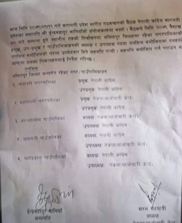 कोञ्ज्योसोम गाउँपालिकामा माओवादीका अध्यक्ष र काँग्रेसका उपाध्यक्ष, बागमती गाउँपालिकाबाट काँग्रेसबाट अध्यक्षर माओवादी केन्द्रबाट उपाध्यक्ष, महाँकाल गाउँपालिकाबाट काँग्रेसबाट अध्यक्ष र माओवादी केन्द्रबाट उपाध्यक्षको उम्मेदवार बन्ने सहमति भएको छ ।